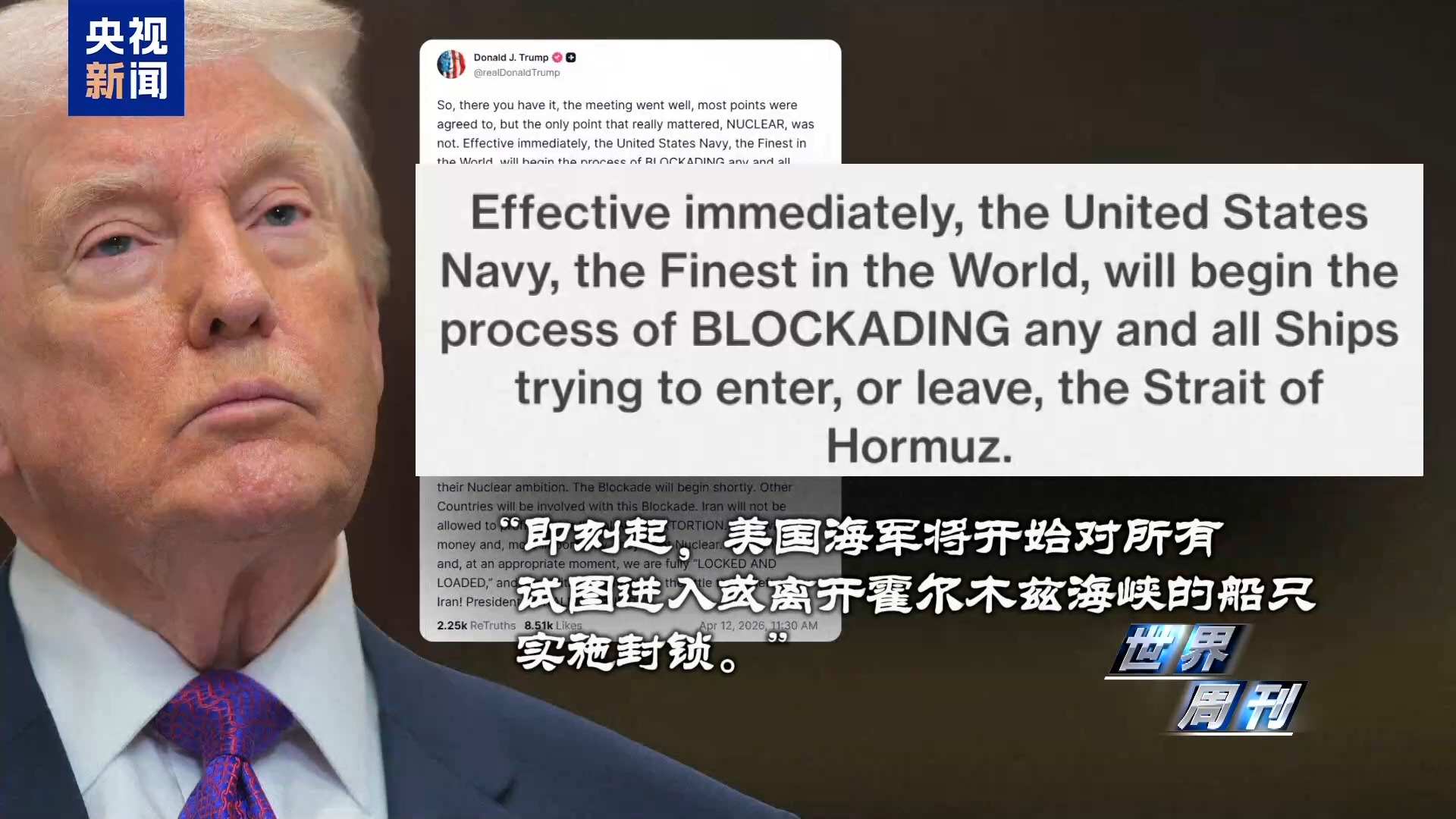 4月12日,美伊第一轮堡谈判破裂后,美国总统特朗普在社交媒体上宣布:“即刻起,美国海军将开始对所有试图进入或离开霍尔木兹海峡的船只实施封锁。”第二天上午,这一“封锁令”正式生效。