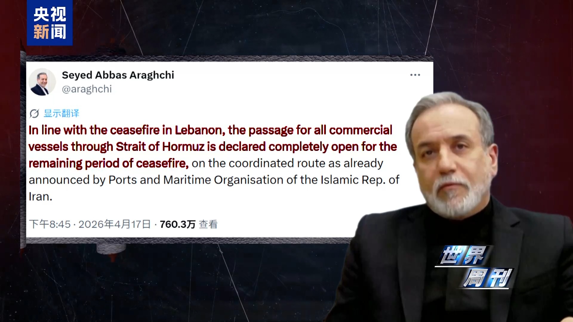 当地时间4月17日,伊朗外长阿拉格齐在社交媒体发帖称,鉴于黎巴嫩和以色列达成为期10天的停火协议,在停火期间,伊朗对所有商船开放霍尔木兹海峡。